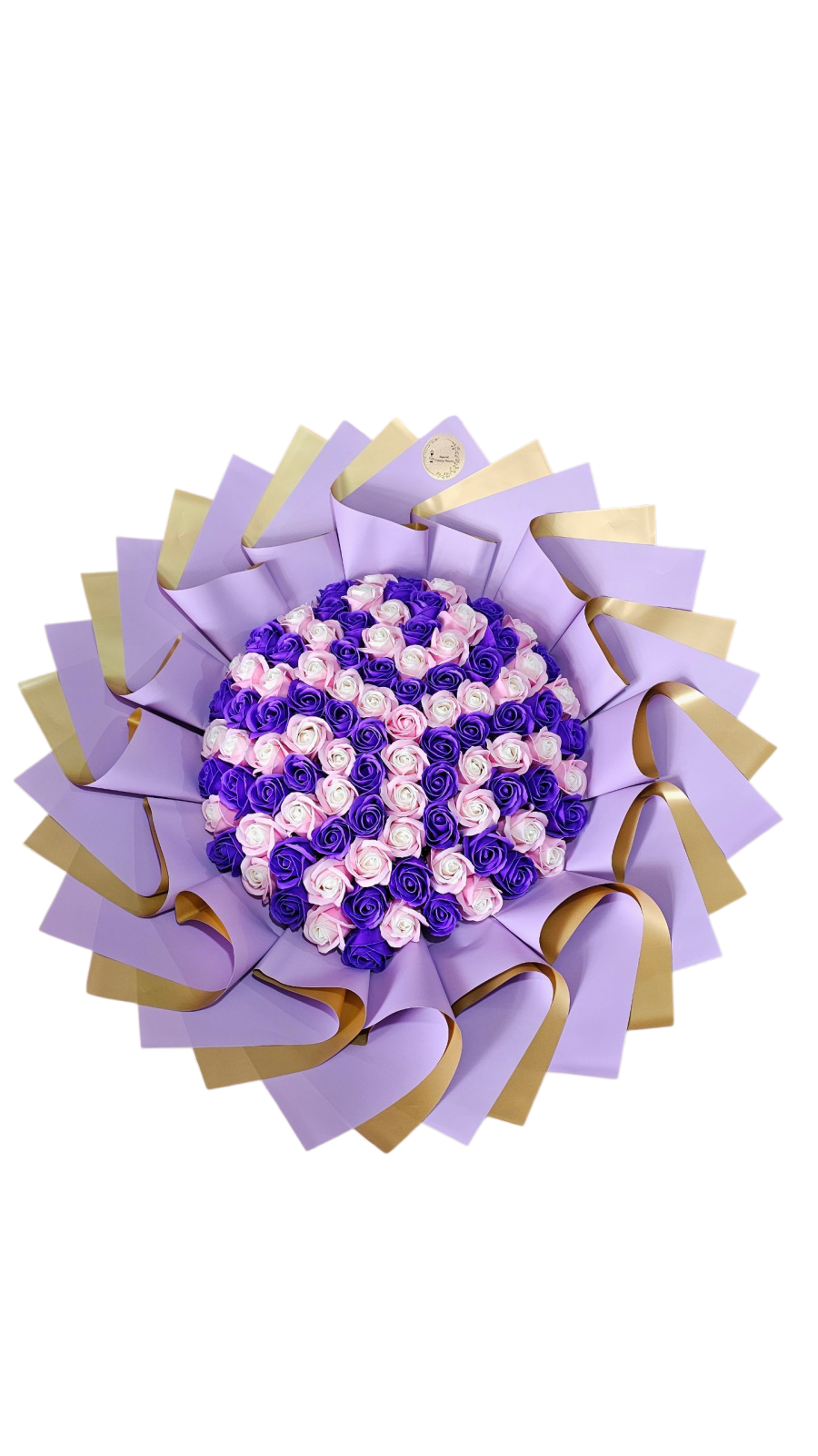 Un buchet spectaculos, alcătuit din 101 trandafiri din săpun mov, roz și alb, realizați manual din săpun parfumat de calitate superioară. Combinația pastelată dintre mov regal, roz pudră și alb perlat creează un efect vizual armonios, plin de rafinament și feminitate.