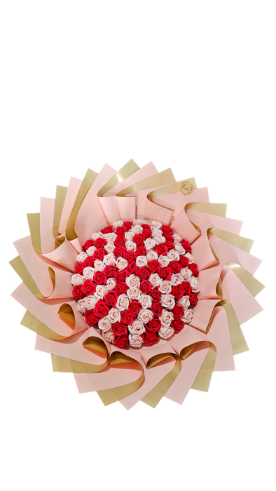 Buchet de lux compus din 101 trandafiri din săpun roșii și albi, aranjați manual într-un design circular rafinat. Fiecare floare este realizată din săpun parfumat de calitate superioară, oferind un aspect natural și o durabilitate excepțională.