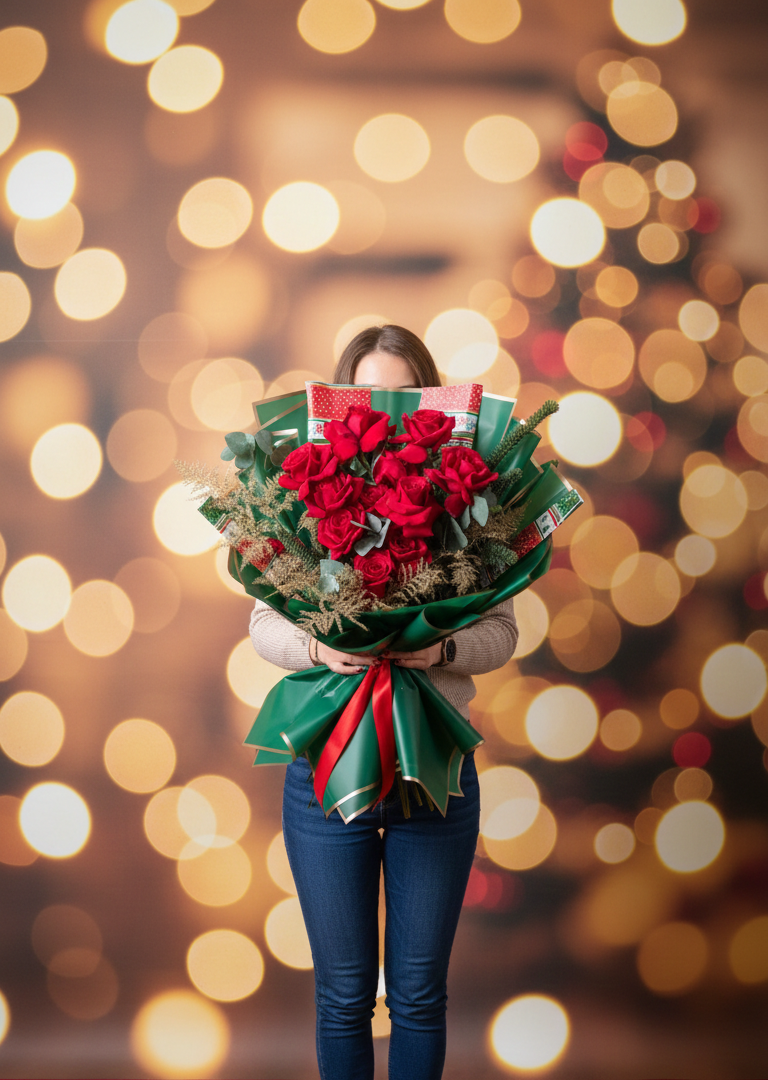 Buchet ediție specială de Crăciun, realizat din 11 trandafiri roșii flexați, completat cu eucalipt, asparagus și crengi de brad natural. Designul este pus în valoare de un ambalaj festiv de Crăciun, în nuanțe elegante de verde și roșu, finisat cu panglică decorativă.