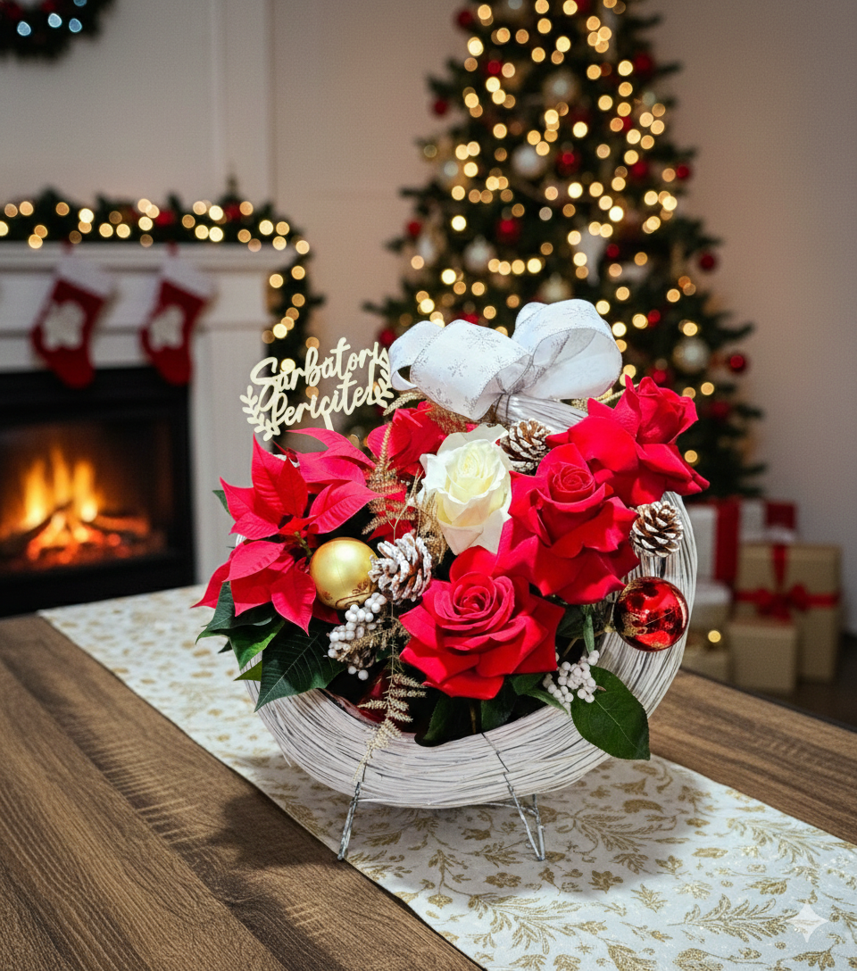 Aranjament festiv în coș semilună, creat manual, cu accent pe eleganță și prospețime. Crăciunița roșie în ghiveci conferă durabilitate și poate fi replantată ulterior, în timp ce trandafirii naturali oferă textura și rafinamentul specific sezonului de iarnă.